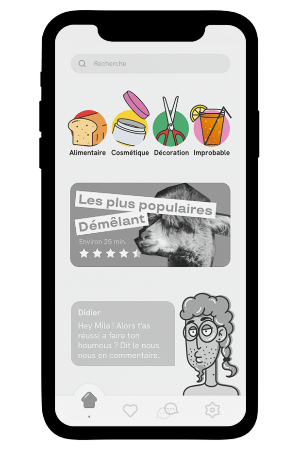 Ma solution était donc de proposer une application sous forme de recettes et d’astuces laquelle permettait de réaliser ses propres produits du quotidien (ceux que les jeunes utilisent) tout en prenant plaisir à le faire.