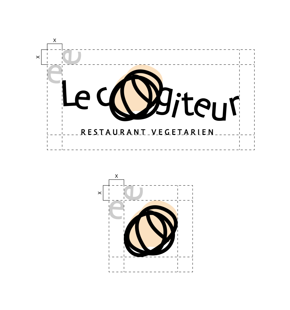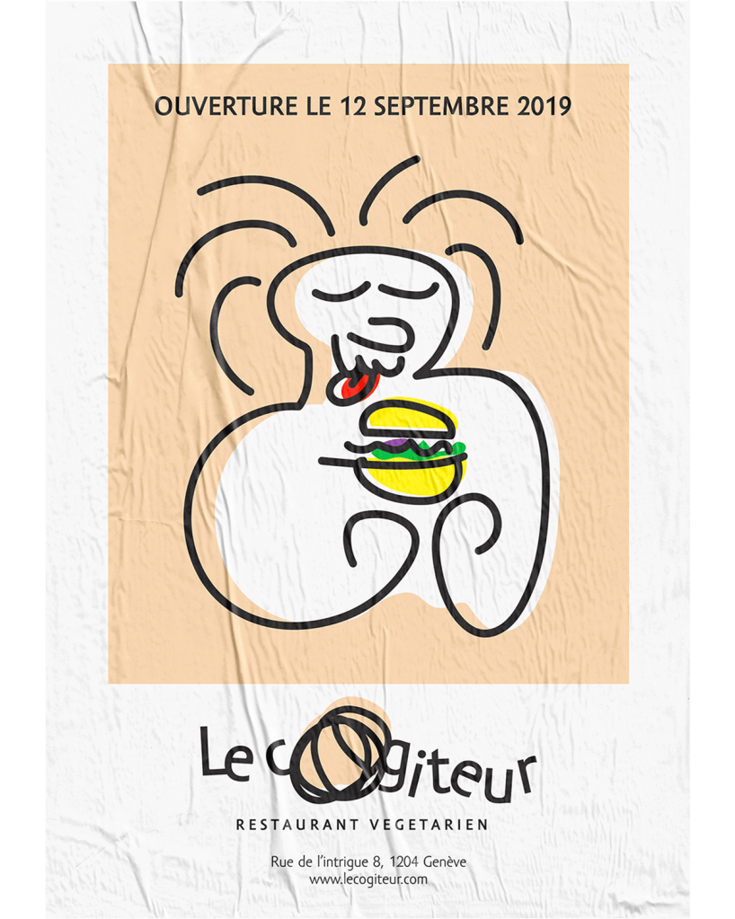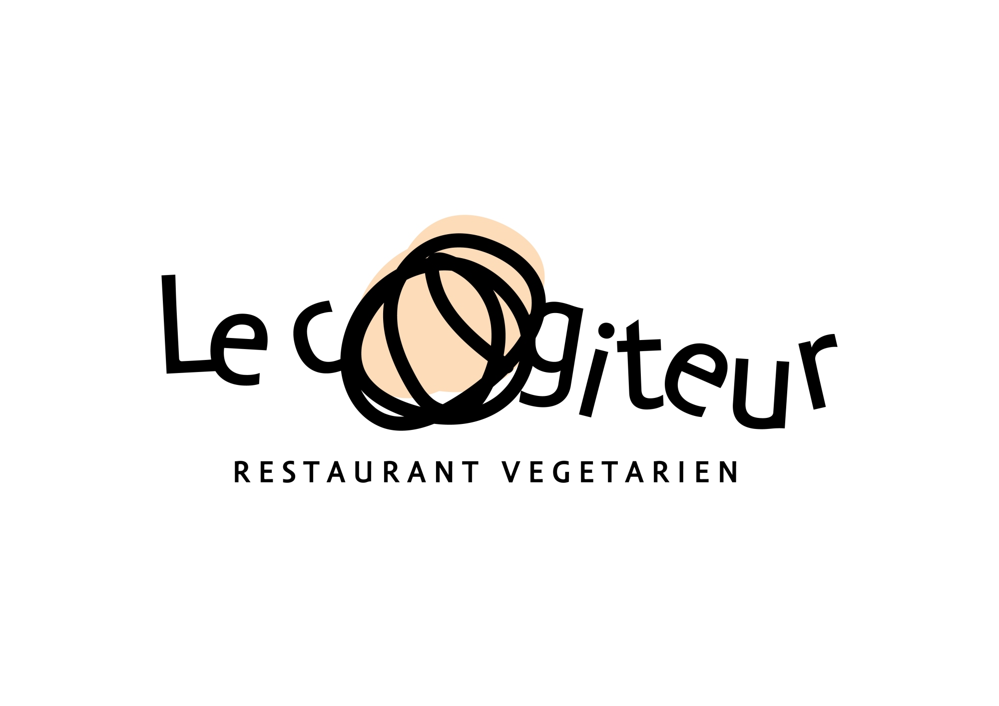 J’ai choisi le nom « Le Cogiteur » car le mot « cogiter » est synonyme de réfléchir et mon objectif est d’intriguer ma cible. Ce mot est familier et ironique car le restaurant se veut léger et s’adresse à sa cible comme un ami.